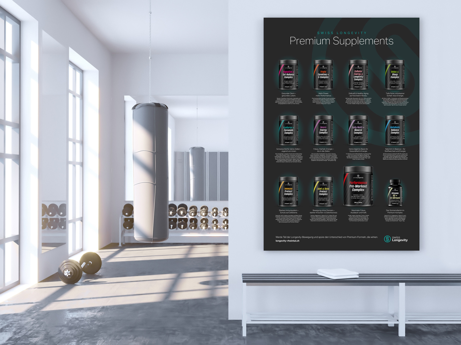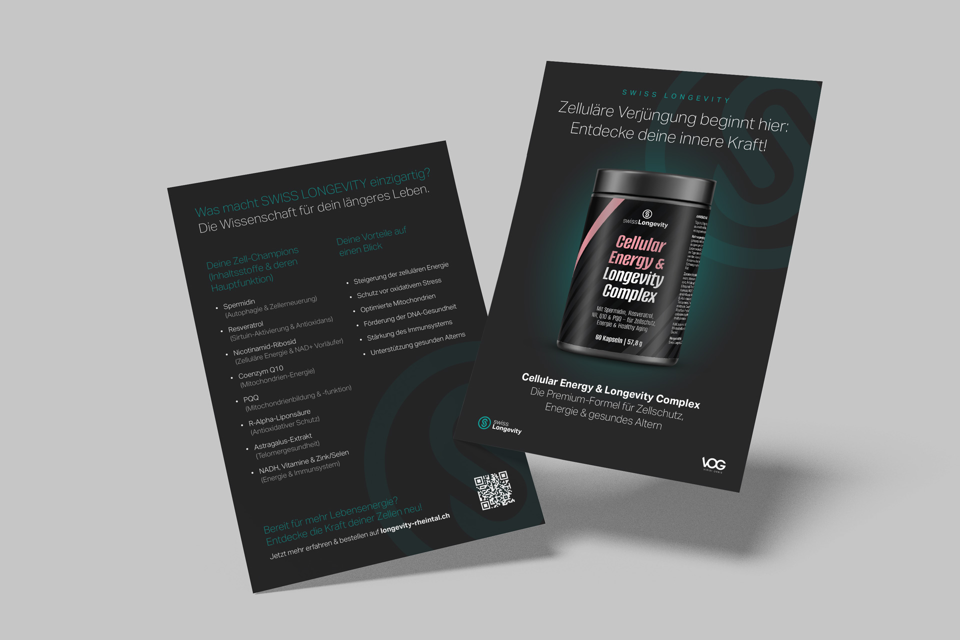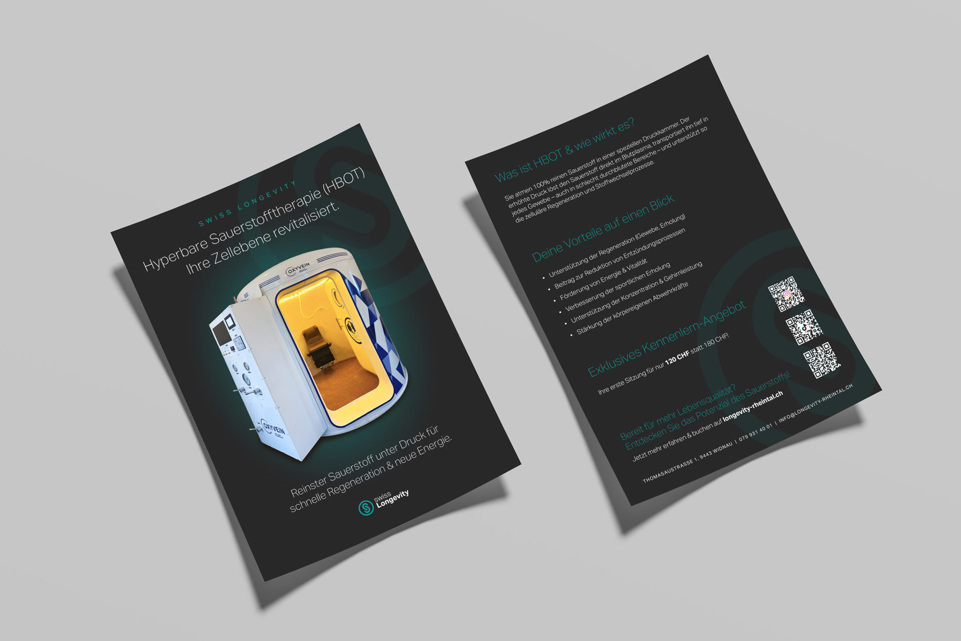 Longevity Rheintal ist ein Gesundheitszentrum in Widnau, das moderne Therapien für Regeneration, Leistungsoptimierung und Wohlbefinden anbietet. Für das Unternehmen haben wir das Logo, die Verpackungsdesigns, Plakate und Flyer gestaltet und damit einen klaren und hochwertigen Markenauftritt geschaffen.